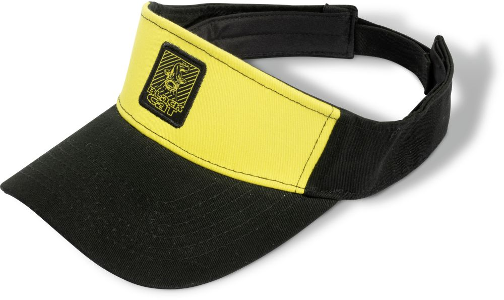 Gelb Schwarzer Visor mit Black Cat Logo, der größenverstellbar ist. Der Visor bietet am Wasser Schutz vor Sonne, ist aber ebenso eine zusätzliche Option für Sport und Freizeit.