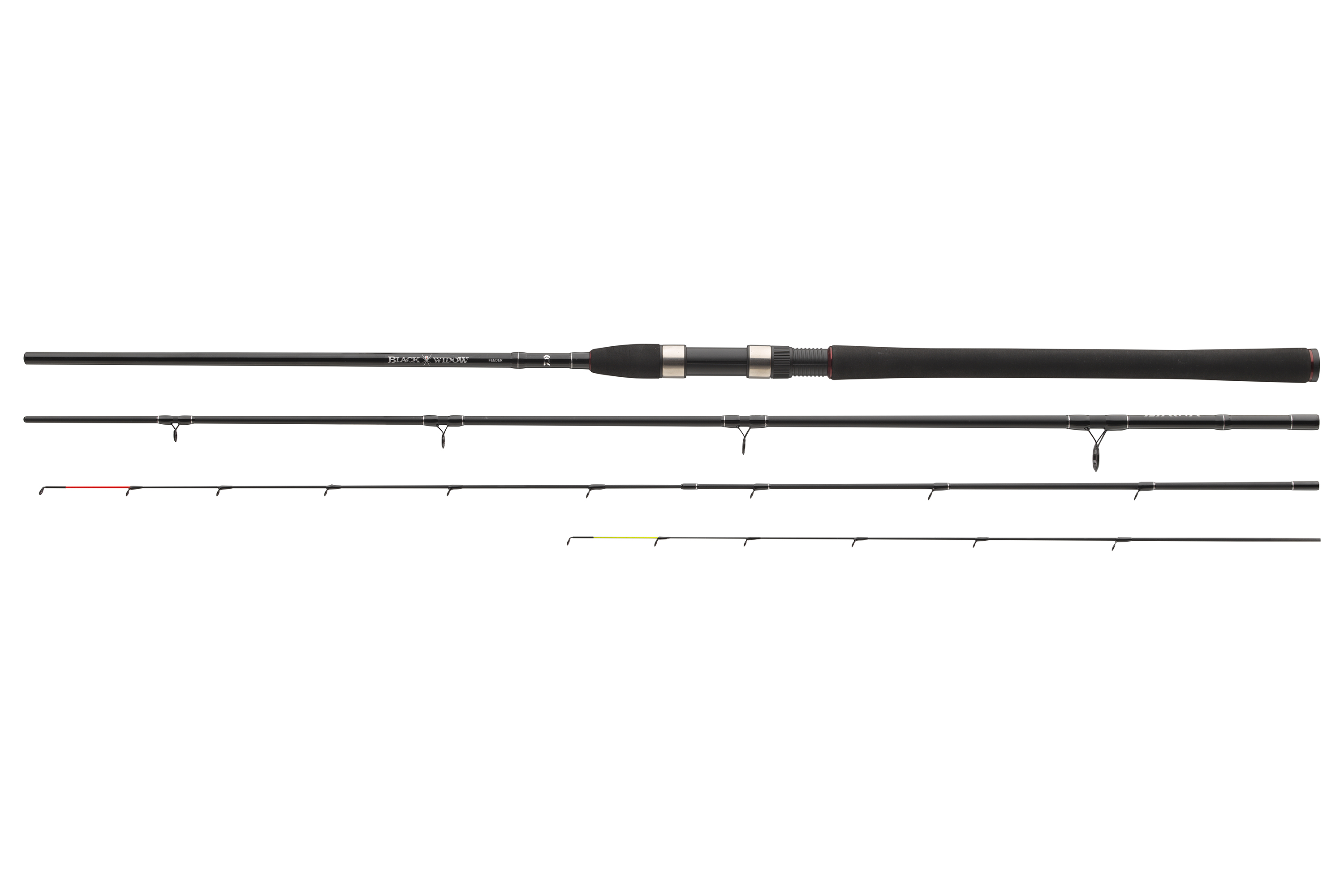 Ausgestattet mit Titanium-Oxyd Ringen werden die Black Widow Feederruten mit zwei Feederspitzen in Gelb und Rot geliefert.