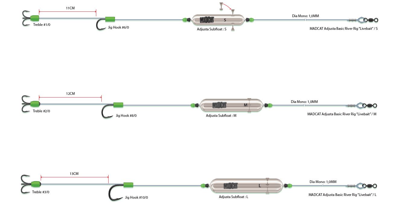 Rigs mit einer MADCAT® Screaming Subfloat für die Grundangelei mit toten Köderfischen, wie z.B. einer Forelle, in stark strömenden Flüssen. Gebunden mit 1,00mm dickem MADCAT® Ultra-Soft Mono Leader. Komplette Länge: 180cm. Erhältlich in 3 Größen: S, M und L (für Köderfischgrößen: 25, 28,5 and 32cm). Tragkraft: 100lb.
