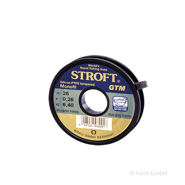 ist die Nr.1 unter den monofilen Angelschnüren. Der TÜV München erklärte sie zur besten monofilen Angelschnur überhaupt - und in dem US Magazin „THE FLYFISHERMAN“ wurde STROFT GTM zum absoluten Tragkraftsieger erklärt (siehe auch www.stroft.de -> Testergebnisse). Der Tuning-Schwerpunkt liegt bei den Zugfestigkeitswerten bei gleichzeitiger Optimierung höchstelastischer Geschmeidigkeit. Bei diesem Prozess, der beständig weiterentwickelt wird, handelt es sich hauptsächlich um Modifizierungen des inzwischen mehrstufigen Temperungsverfahrens. Daher auch das Kürzel GTM (Getempertes Monofil). Ebenso ist die Zusammensetzung der „Polyamid-Legierung” (siehe auch Katalog Seite 4) in beständiger Entwicklung. Wenn Entwicklungsergebnisse eindeutige Verbesserungen anzeigen, so fließen diese nach ausgiebiger Testphase in die Serienproduktion ein. So konnten bei der STROFT GTM, die sämtliche Stufen der Veredelung und der Abstimmung durchläuft, im Laufe der Jahre, neben der wichtigsten Eigenschaft, der Knotentragkraft, auch die Gleitreibung, Haftreibung, Oberflächenhärte, Oberflächenglätte, Streckgrenze, Bruchdehnung, Feinlastdehnung, Anhiebdehnung, Drilldehnung, Sensibilität, Rückmeldung, Memory, Flexibilität, Geschmeidigkeit und Weichheit immer wieder verbessert und optimiert werden.