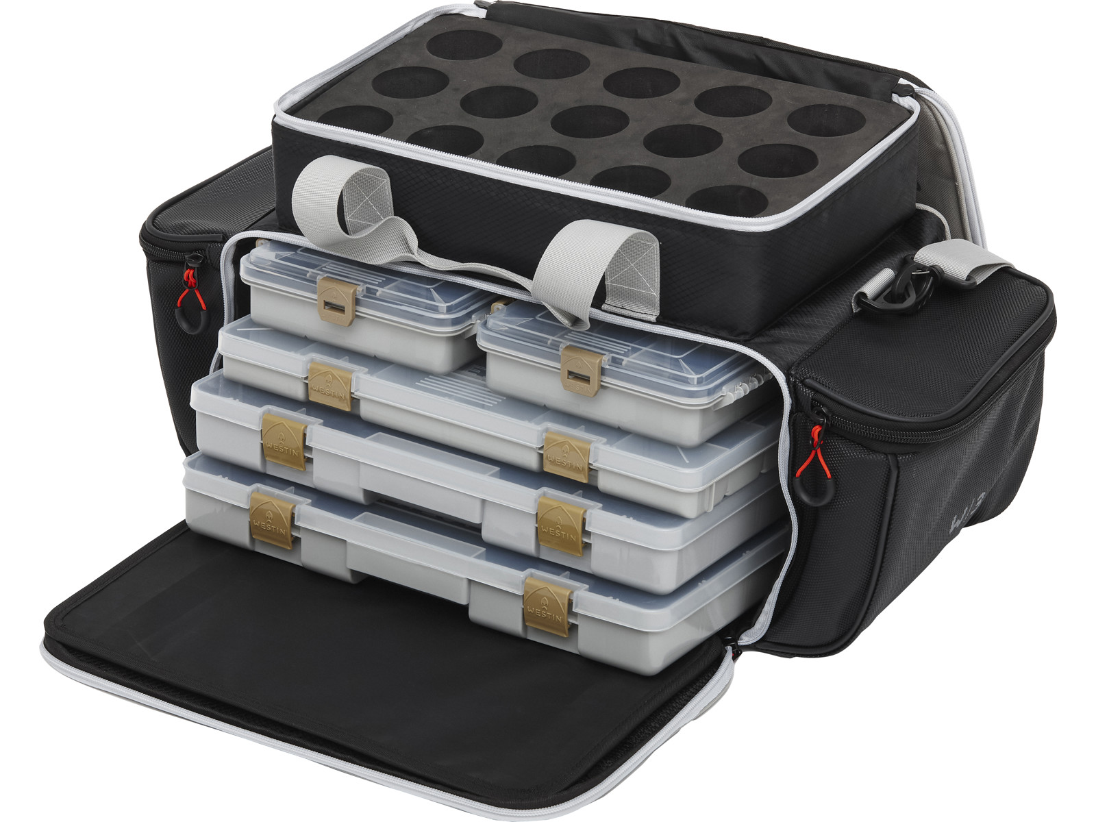 - Oberes Fach mit EVA-Halterung für Teig-/Weichköderbehälter
